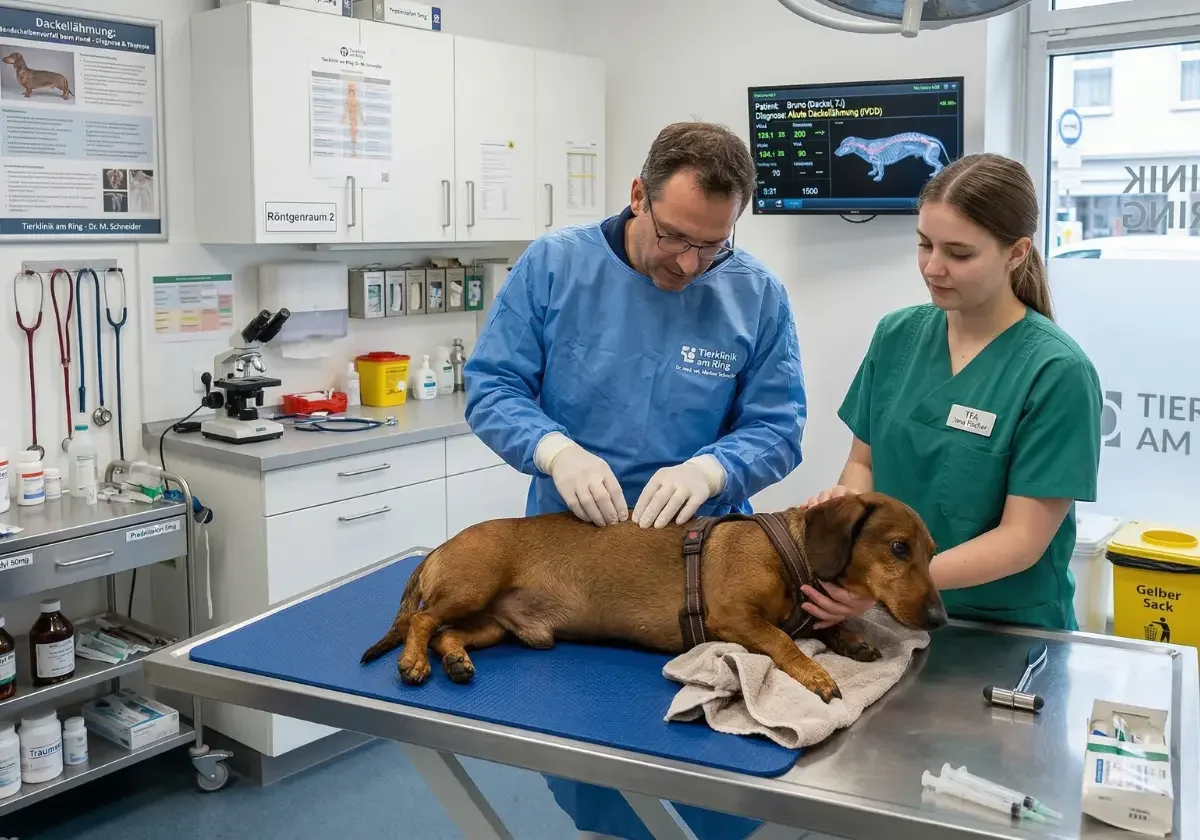 Bei einem Bandscheibenvorfall geht es nicht nur um Rückenschmerzen, sondern um die Frage, wie stark das Rückenmark bereits geschädigt ist. Davon hängen Behandlung, Zeitfenster und Prognose direkt ab. In leichten Fällen können strikte Ruhe, Schmerzmittel und engmaschige Kontrolle ausreichen. In schwereren Verläufen braucht der Hund oft weiterführende Diagnostik wie CT oder MRT und unter Umständen eine Operation zur Entlastung des Rückenmarks. Genau hier unterschätzen viele Halter das Thema anfangs. Die Kosten entstehen nicht erst im OP-Saal, sondern oft schon durch neurologische Untersuchung, Bildgebung, Narkose, Klinikaufenthalt und Nachsorge. Wer Dackellähmung richtig einordnen will, muss deshalb immer drei Punkte zusammen betrachten: medizinische Dringlichkeit, neurologische Folgen und finanzielle Tragweite.