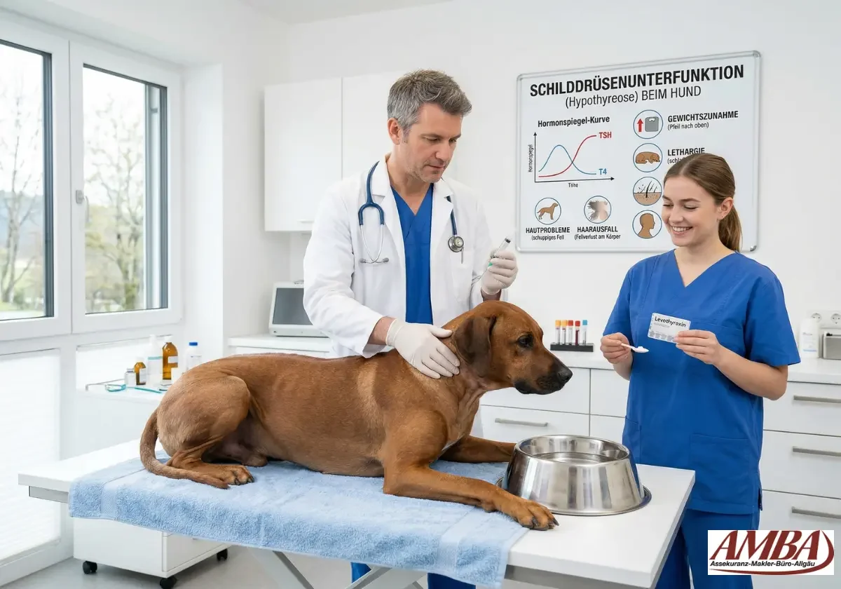 Entscheidend ist deshalb eine saubere Abklärung statt eines Schnellurteils. Eine belastbare Diagnose stützt sich auf klinische Zeichen, Gesamt-T4, freies T4 und TSH. Ein einzelner niedriger T4-Wert reicht nicht, weil auch andere Hundeerkrankungen oder Medikamente die Werte verfälschen können. Für Halter wird das Thema schnell auch finanziell relevant, weil sich aus einer scheinbar einfachen Müdigkeit oft eine Kette aus Erstuntersuchung, Blutprobenentnahme, Labor, Kontrollterminen und lebenslanger Levothyroxin-Therapie entwickelt. Schon im einfachen GOT-Satz liegen allgemeine Untersuchung, Folgeuntersuchung und venöse Blutprobenentnahme bei 23,62 Euro, 19,74 Euro und 10,26 Euro. Labor, Arznei und Wiederholungskontrollen kommen obendrauf. Wer Versicherungsschutz prüft, sollte deshalb genau auf Diagnostik, Verlaufskontrollen und Dauermedikation achten.