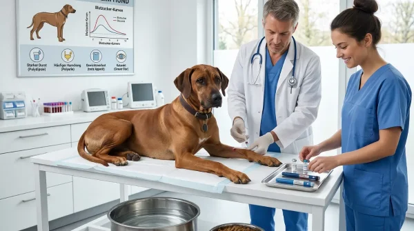 Tierarzt untersucht den Bauch eines Hundes, während eine Helferin Blutproben für die Diagnostik des Cushing-Syndroms vorbereitet