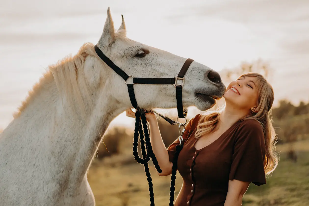 Frau lacht mit einem weißen Pferd auf der Weide bei Sonnenuntergang – Symbolbild für Uelzener Pferdeversicherung