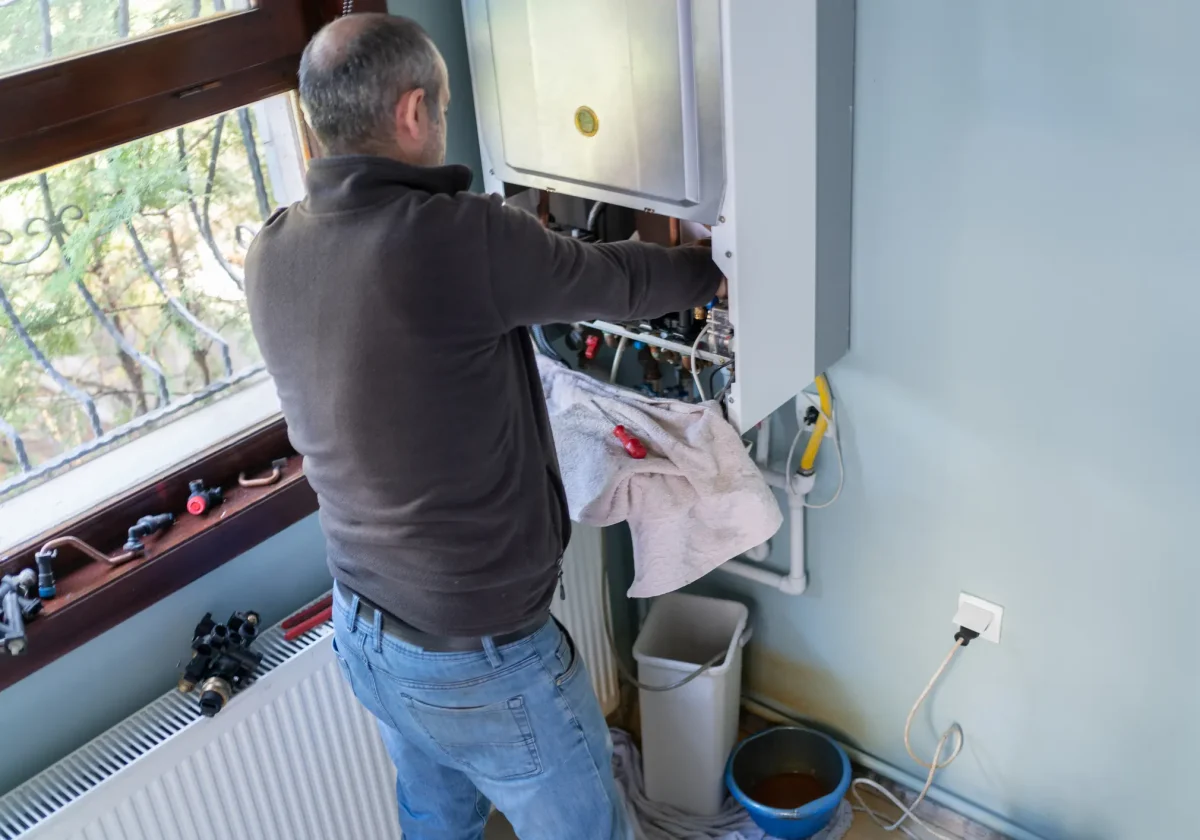 Monteur bei der Reparatur einer defekten Heizungsanlage – Blick auf geöffnete Heiztherme, Werkzeug, Wassereimer und Arbeitsmaterial im Raum.