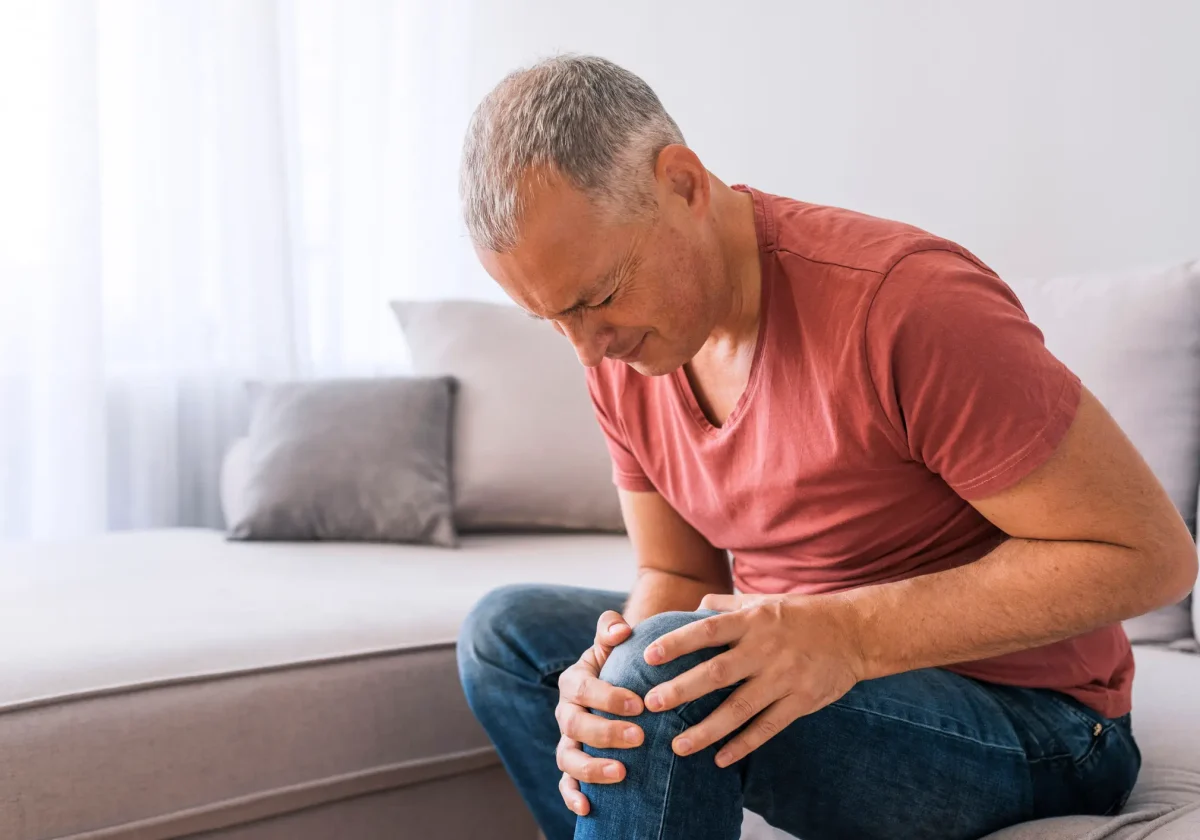 Mittelalterlicher Mann sitzt auf dem Sofa und hält sich schmerzhaft das Knie – möglicherweise Meniskusriss nach Unfall